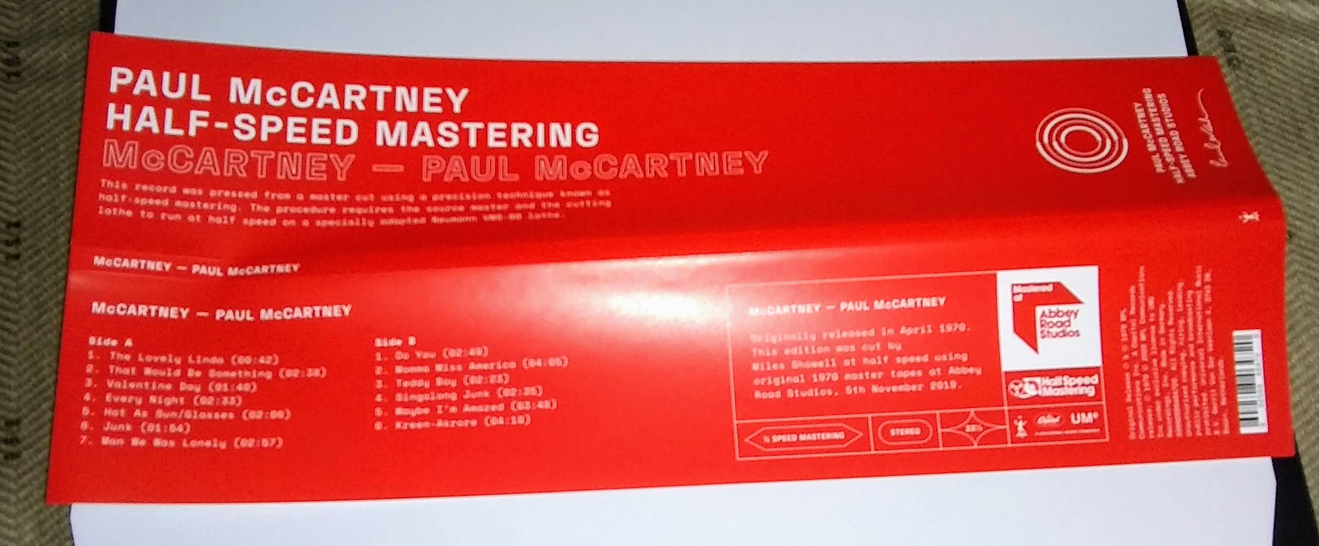 Don’t get me wrong the early UK pressing has nice bass too but this new pressing seemed to have a bit more detail and smoothness especially on the tracks McCartney did in EMI Studios as opposed to the other songs he recorded strictly at home.