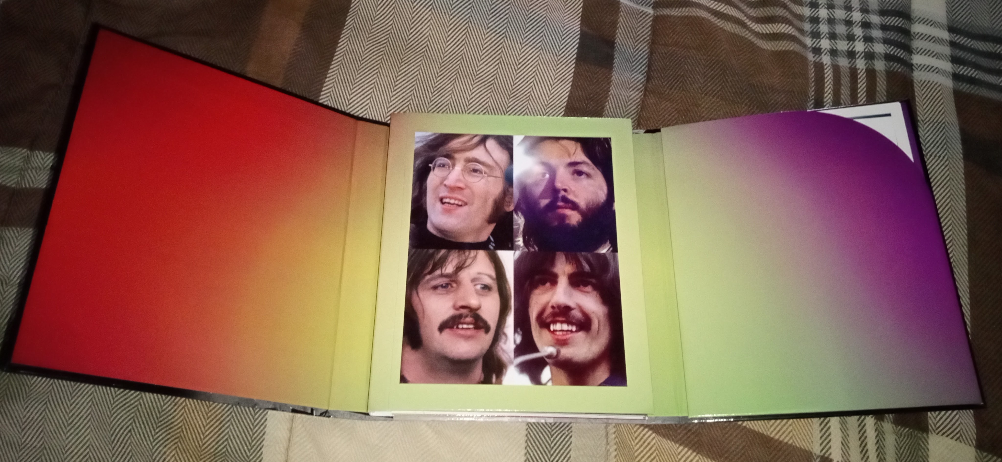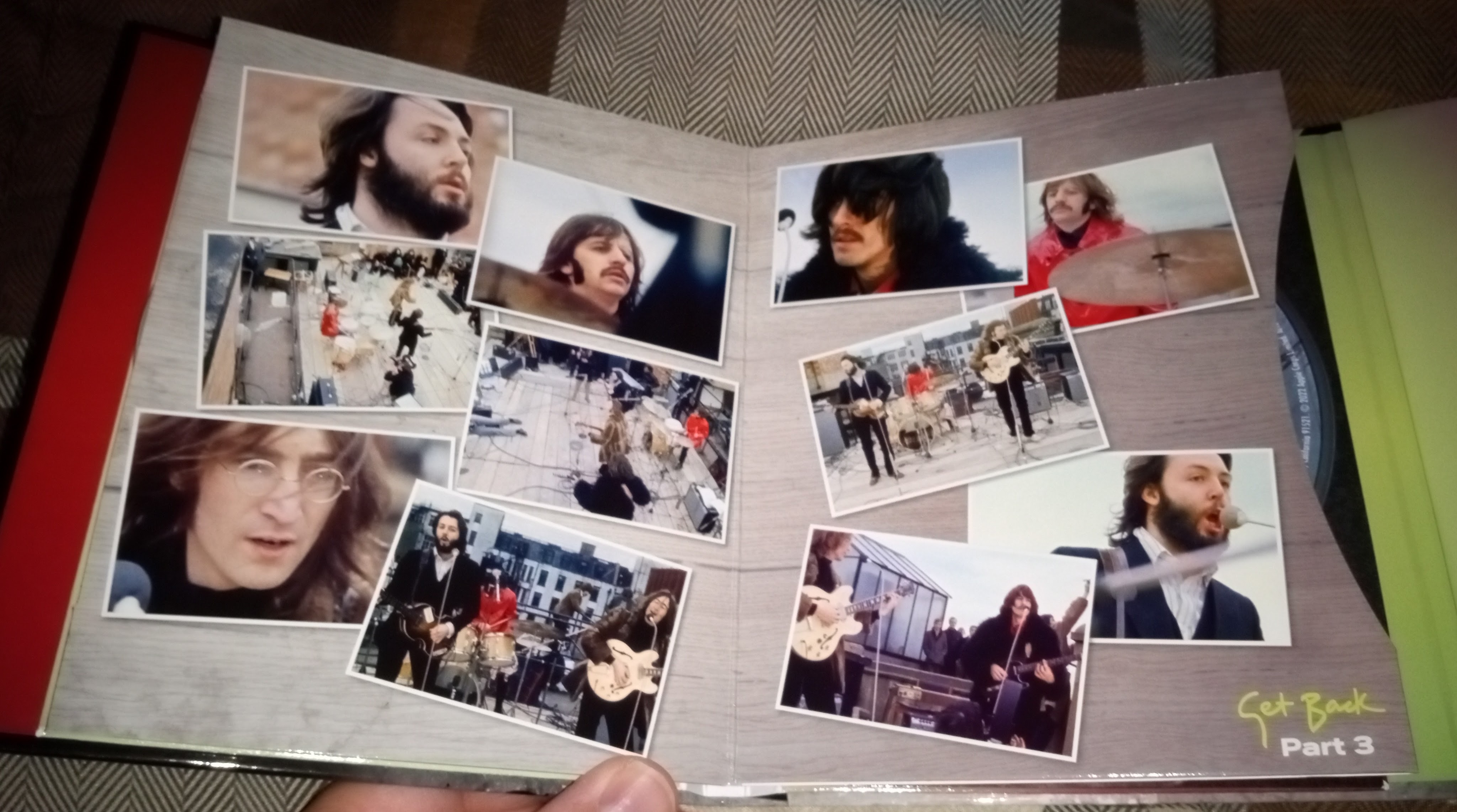 It has an attractive hard cover that also holds a hard cover book inside. The book contains sleeves covered in pictures from the “Get Back” sessions and those sleeves hold the discs (see photos above and below). There are also four small card photos of each Beatles in a slot in the back of the inner book which is a nice touch has well.