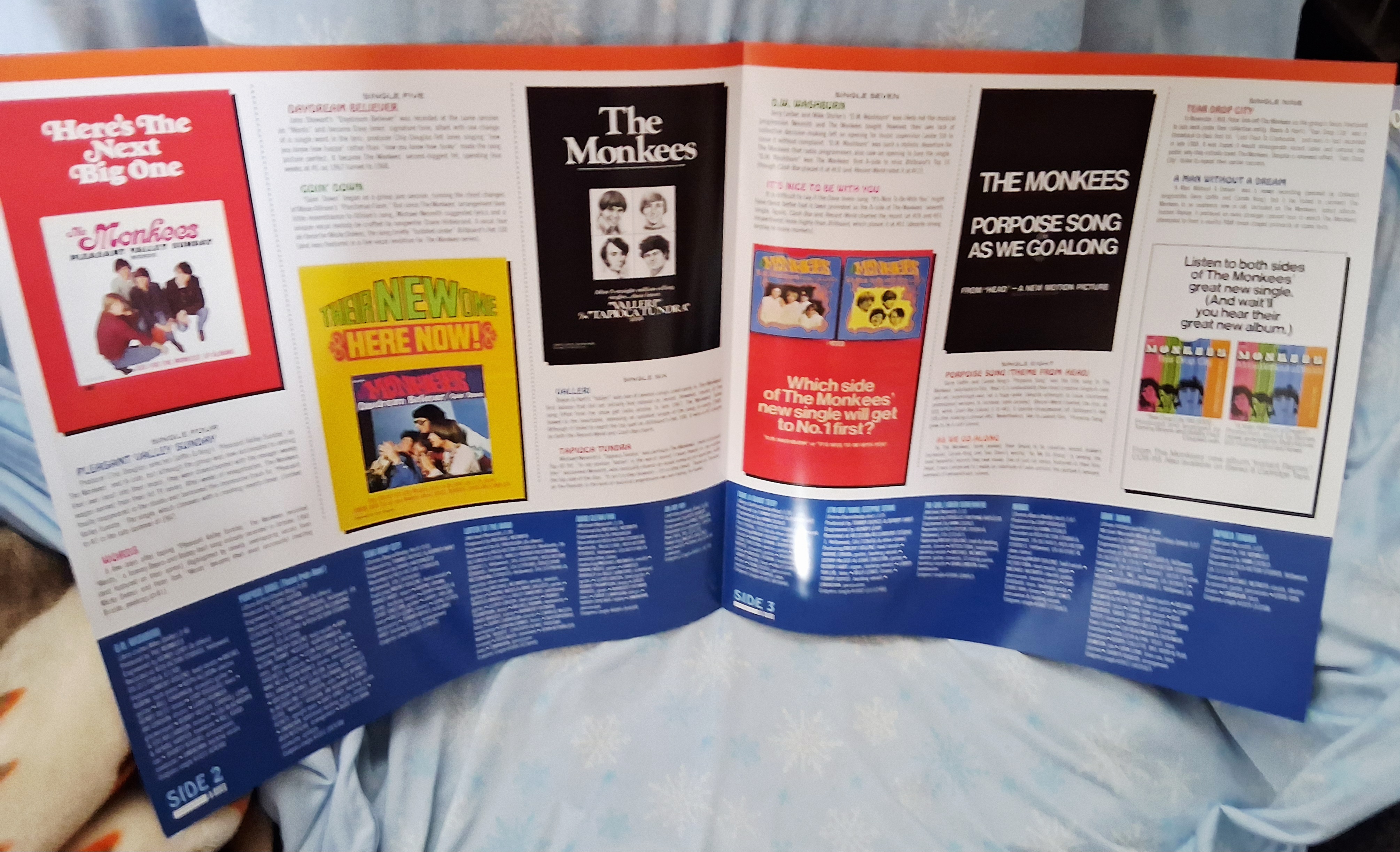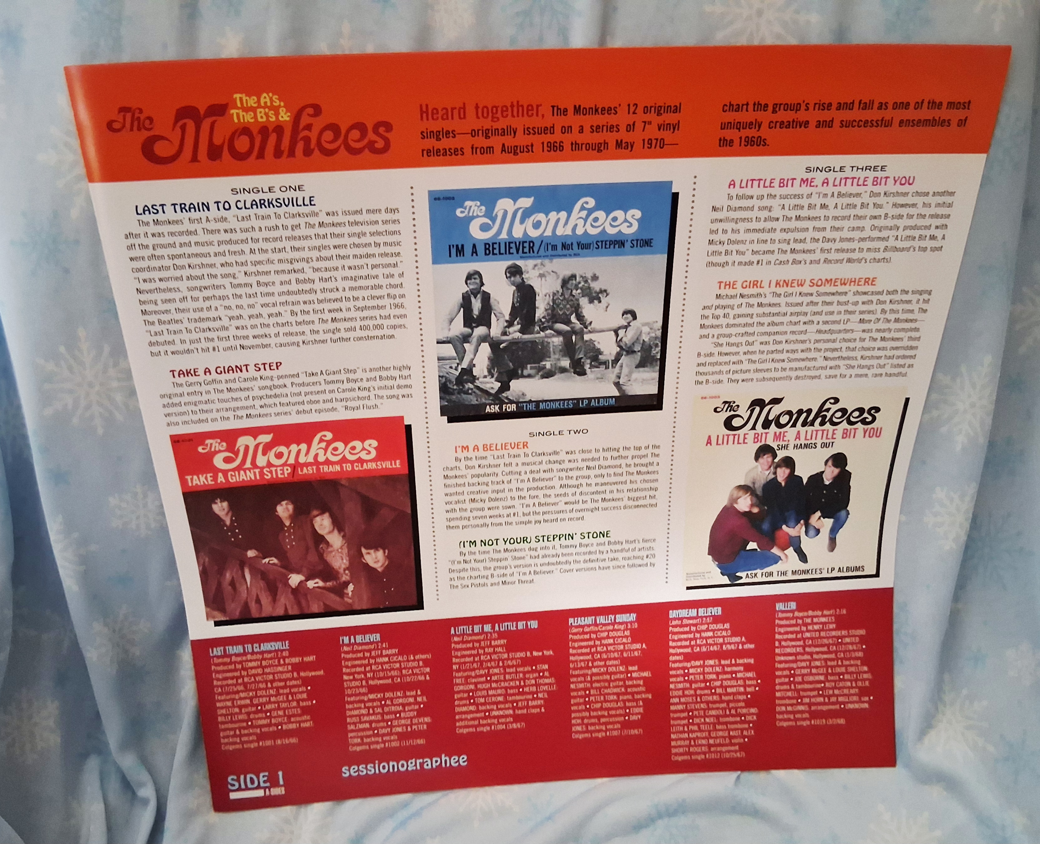 As usual you can see photos of the new 2 Lp set of “The A’s, The B’s & The Monkees” above with it’s lovely large four-page pamphlet and groovy top-opening cover and great Colgems like record labels.